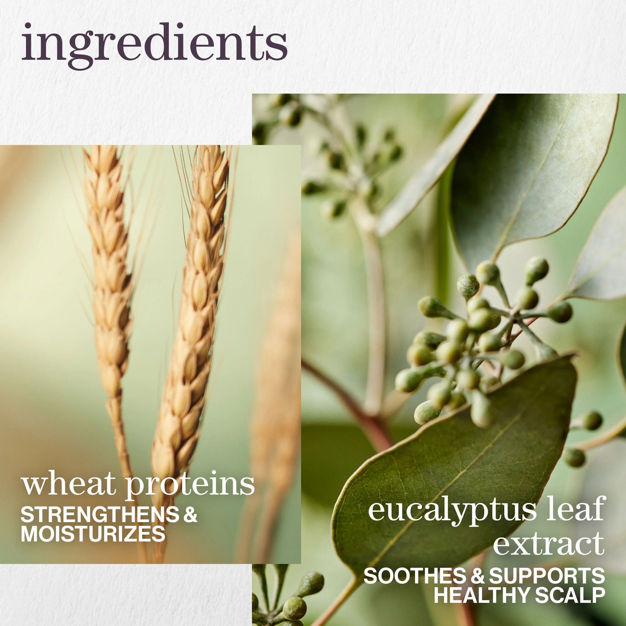 Eucalyptus and Mint: Provide a cooling, fresh feel that leaves the scalp feeling revitalized and thoroughly cleansed.